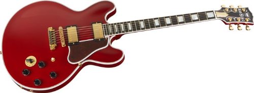 In the history of all music, there has never been a guitar associated with one musician quite like blues legend B.B. King is linked to his beloved Lucille a custom-built Gibson ES-355 manufactured exclusively for the true "King of the Blues" since 1980. And B.B. King is not only the most renowned blues musician of our time; he's also one of the most important electric guitarists of all-time. His singular bluesy style has influenced generations of players across genres, and his powerful and distinct songs have appeared on the charts more than 70 times, from blues to R&B to pop. B.B. King Lucille Gem Series electric guitars are a limited release of BB King's iconic "Lucille" finished in dazzling colors. Today's B.B. King Lucille from the Gibson Custom Shop is made to exactly the same specifications as the guitar played by King himself. The most outstanding qualities that make this instrument his own include a body with no f-holes and a fine-tuner tailpiece. The body consists of plain laminated maple top, back, and rims, with multi-ply binding on both the top and back. The neck is a three-piece maple neck with Gibson's traditional rounded profile, a scale length of 24 3/4-inches, and a 22-fret ebony fingerboard that is outlined with single-ply binding and adorned with genuine pearl block inlays. The Gibson Lucille is loaded with dual 490 humbucking pickups that feature alnico magnets for a classic tone that is well balanced, smooth, and warm. The 6-position Varitone switch circuitry adds capacitors of different value to the circuit. The capacitors act as a notch filter, so each position on the switch notches out mid-range frequencies, thinning out the sound. You'll get a surprising range of great tones that will let you cover any musical turf. Stereo wiring provides both stereo and mono connections, with two output jacks on the lower bout. Other standard appointments include all gold hardware, metal tulip tuners, a Nashville Tune-O-Matic bridge and TP-6 fine tuning tai